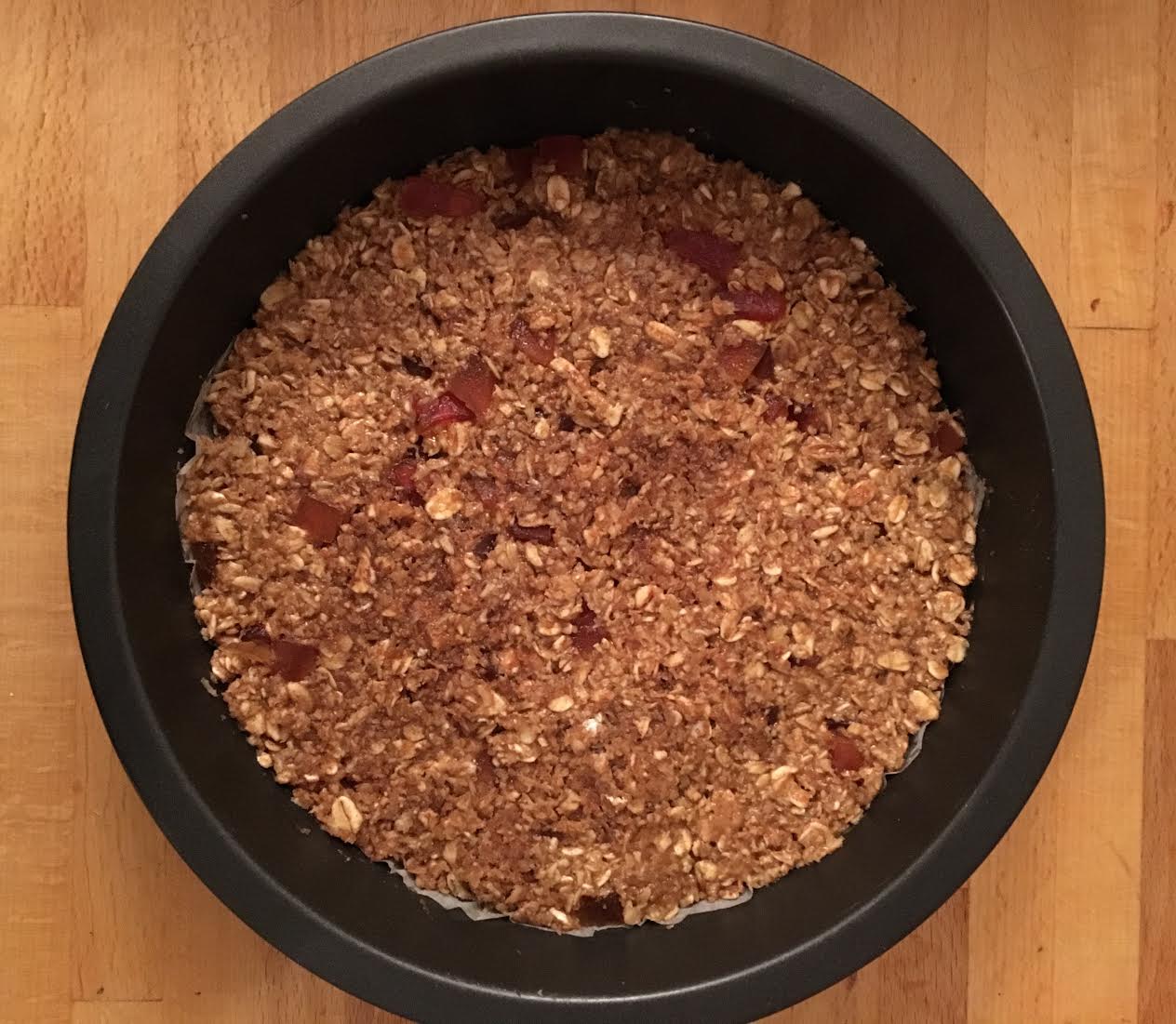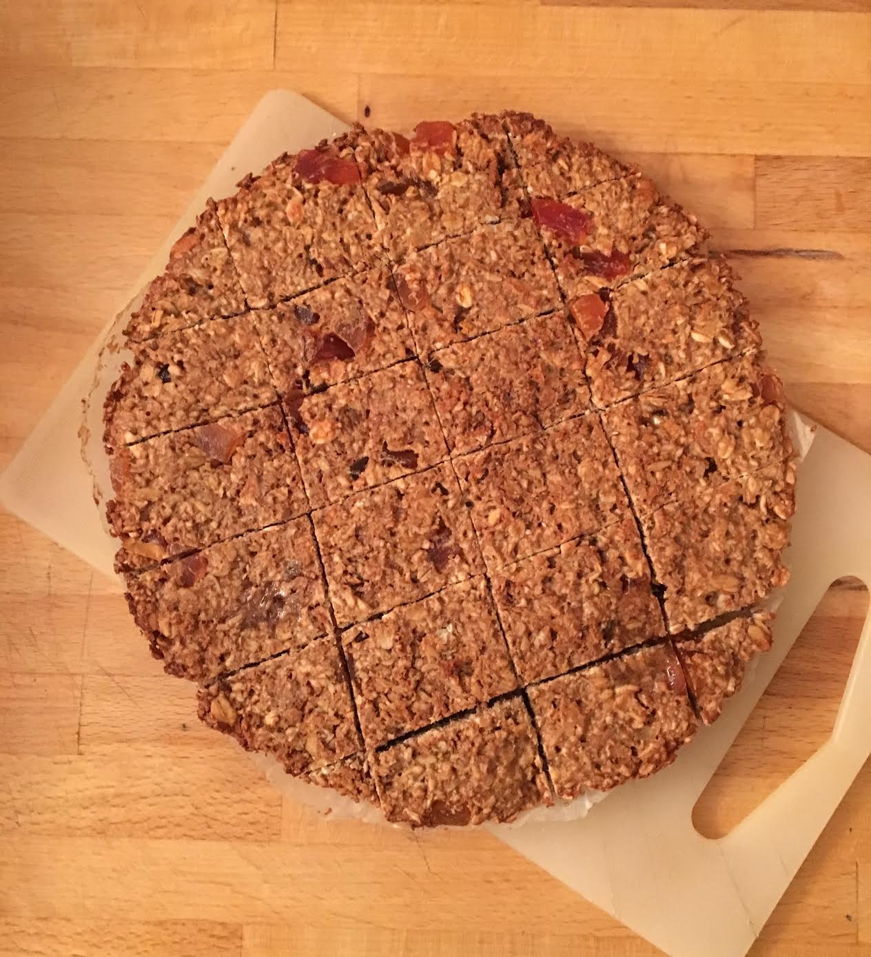 Place all the ingredients into a medium saucepan and stir them for a few minutes on a low heat. Spoon the mixture onto a baking tray, smooth it down with a spatula or the back of a spoon and bake for 20 minutes at 180ºC.